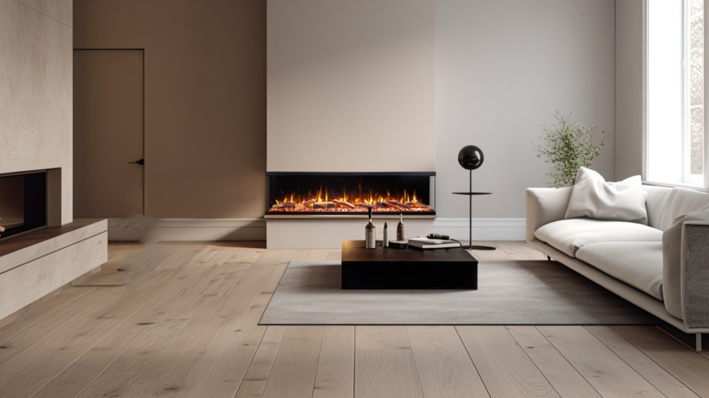 Kominek elektryczny trójstronny bez funkcji grzania Aflamo Unique NH o szerokości od 80 do 180 cm, sterowany aplikacją mobilną z polanami i kryształkami w zestawie. Wysoka jakość wykonania, realistyczny ogień 3D na trzy strony.